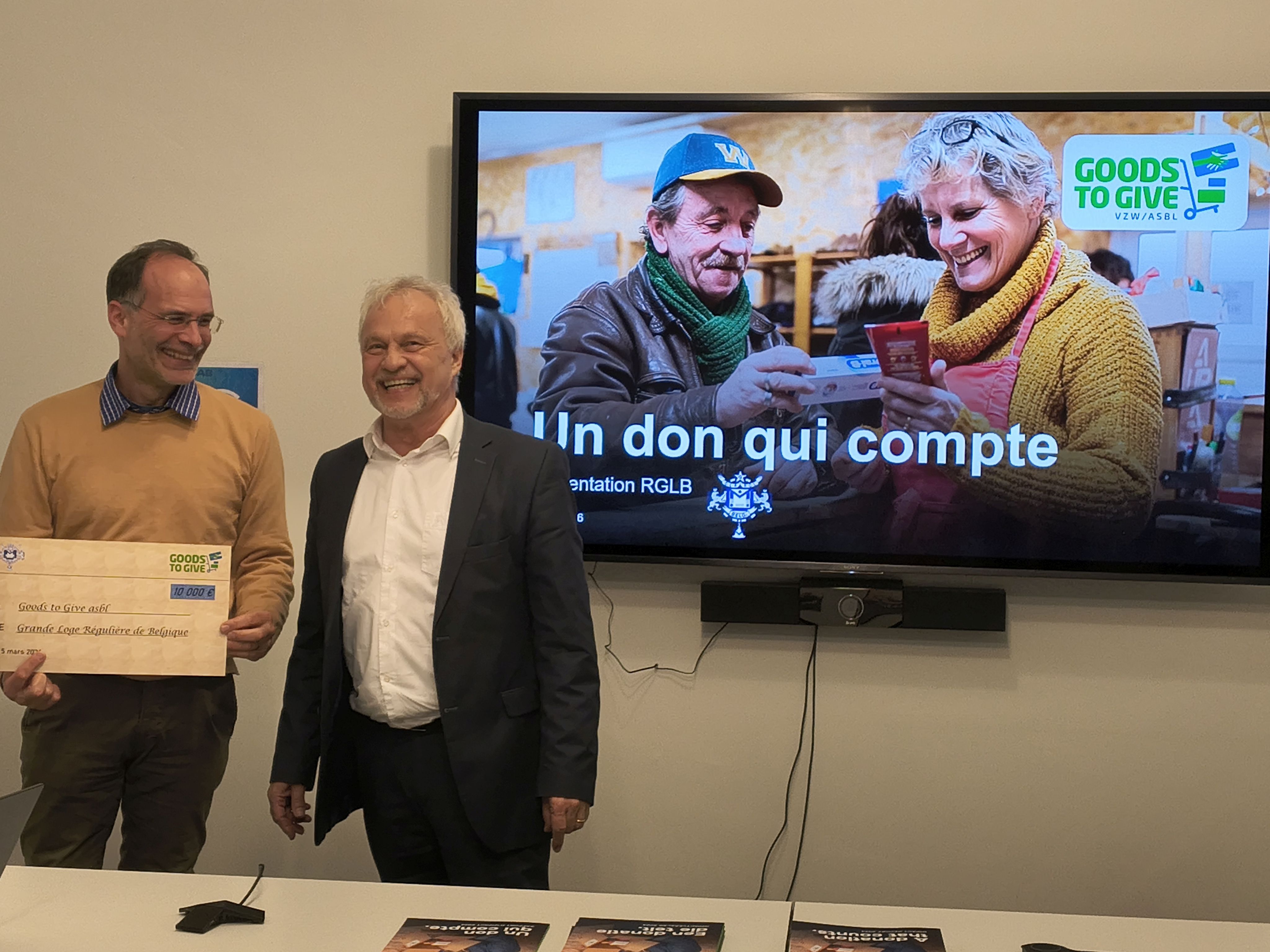 De Reguliere Grootloge van België hecht veel belang aan liefdadigheid. Zij heeft een nauwe samenwerking opgebouwd met de vereniging Goods to Give, die zich inzet om de donatie van niet-voedingsproducten – die essentieel zijn voor het dagelijks leven – te vergemakkelijken voor mensen die met armoede en sociale uitsluiting worden bedreigd. In één jaar tijd heeft zij via haar loges al meer dan 20.000 euro ingezameld voor Goods to Give.